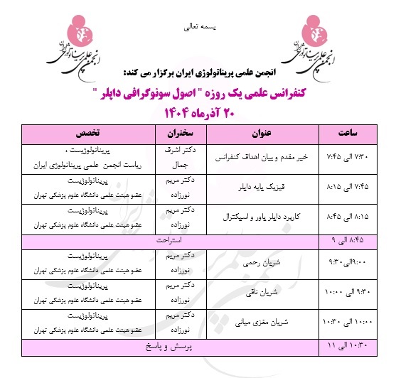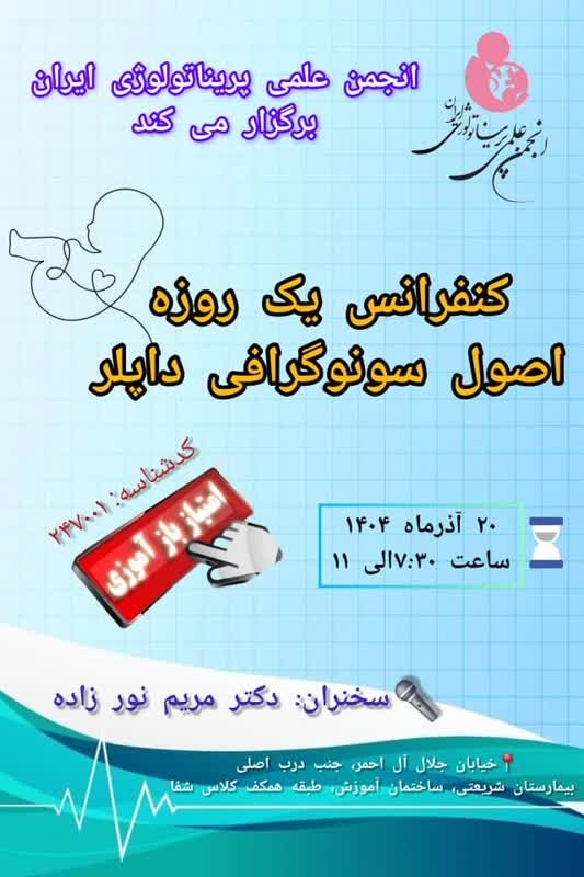 کنفرانس یک روزه "اصول سونوگرافی داپلر" در تاریخ ۲۰ آذرماه ۱۴۰۴ ساعت ۷:۳۰ با امتیاز باز آموزی و کدشناسه: ۲۴۷۰۰۱در خیابان جلال آل احمر، جنب درب اصلی بیمارستان شریعتی، ساختمان آموزش، طبقه همکف کلاس شفا برگزار خواهد شد. از علاقه مندان به این بحث دعوت می گردد در این کنفرانس یک روزه که توسط "انجمن علمی پریناتولوژی ایران" بصورت رایگان برگزار می گردد، شرکت نمایند.