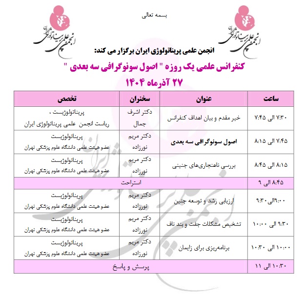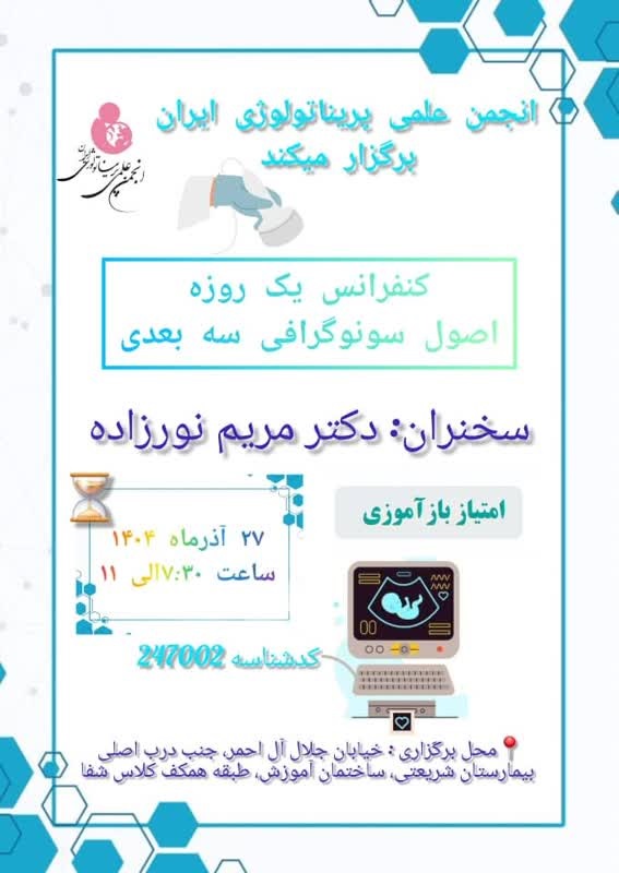 انجمن علمی پریناتولوژی ایران قرار است کنفرانس یک روزه "اصول سونوگرافی سه بعدی" را در ۲۷ آذرماه ۱۴۰۴ ساعت ۷:۳۰ الی 11 در خیابان جلال آل احمر، جنب درب اصلی بیمارستان شریعتی، ساختمان آموزش، طبقه همکف کلاس شفا برگزار نمایند.