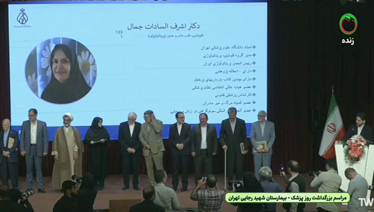 در مراسم باشکوه بزرگداشت روز پزشک در روز دوشنبه سوم شهریورماه 1404 در بیمارستان شهید رجایی تهران به همت سازمان نظام پزشکی جمهوری اسلامی ایران با حضور مسئولین کشور و جمعی از مدیران از جمله معاون اول محترم ریاست جمهوری آقای دکتر محمدرضا عارف،آقای دکتر محمدرضا ظفرقندی وزیر بهداشت، درمان و آموزش پزشکی، آقای دکتر رئیس زاده رئیسکل سازمان نظام پزشکی، خانم دکتر مهاجرانی سخنگوی محترم دولت، حجت السلام و المسلمین آقای دکتر خسرو پناه دبیر محترم شورای عالی انقلاب فرهنگی، آقای دکتر پاکمهر نائب رئیس اول کمیسیون بهداشت و درمان شورای اسلامی و آقای دکتر محمود فاضل ریاست محترم نظام پزشکی جمهوری اسلامی، برگزار شد از ریاست انجمن علمی پریناتولوژی خانم دکتر اشرف جمال به عنوان پزشک نمونه تقدیر به عمل آمد.